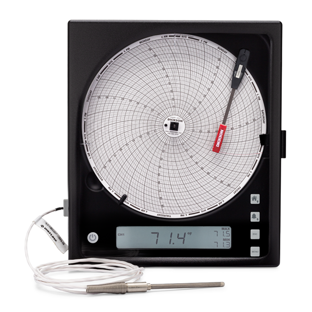 美國DICKSON KT8-40 8英寸(203 毫米)圖表記錄儀提供所有圖表記錄儀中較大的分辨率?,F(xiàn)在具有可更換傳感器,校準(zhǔn)您的圖表記錄儀比以往任何時候都更容易。所有圖表記錄儀均配有 8 英寸大圖表和用戶可選擇的記錄時間范圍(1 天、1 周)和范圍。