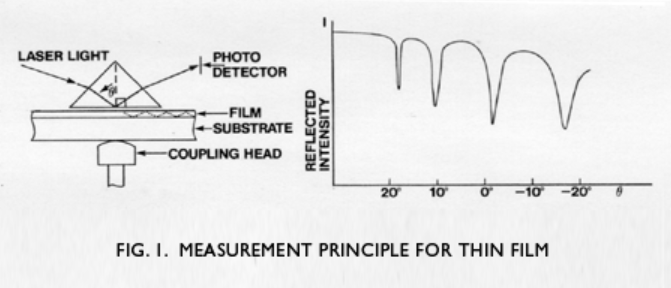 待測樣品(下圖 1)通過氣動耦合頭與棱鏡底部接觸,在薄膜和棱鏡之間形成一個小氣隙。激光束撞擊棱鏡的底部,通常在棱鏡底部完全反射到光電探測器上。在入射角的某些離散值(稱為模式角)下,光子可以穿過氣隙進入薄膜并進入引導(dǎo)光傳播模式,從而導(dǎo)致到達檢測器的光強度急劇下降: