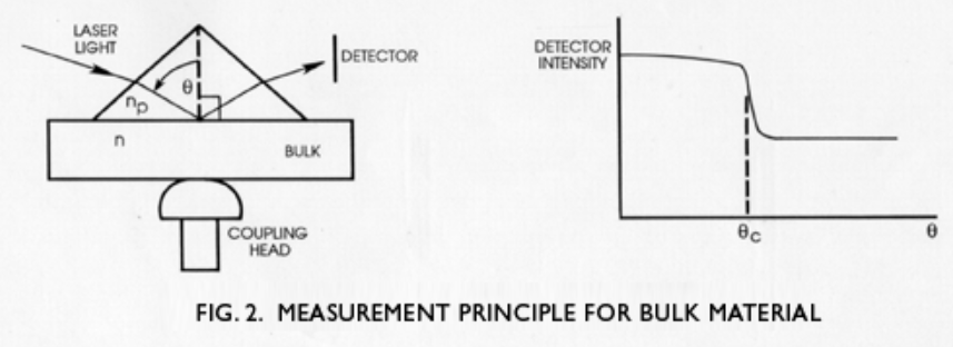 當(dāng)用作折光儀測量塊狀材料的折射率時(上圖 2),樣品也被夾在棱鏡上,并通過測量樣品/棱鏡界面的臨界角 θc 來確定折射率。厚度超過 10-15 微米的薄膜通常顯示出明顯的臨界拐點角,可以作為散裝材料進行測量。柔性材料易于測量,并且有一個電解池可用于液體測量。與大多數(shù)單波長(通常為 589 nm)的傳統(tǒng)折光儀不同,2010/M 可配備多達五個激光器,從而可以在較寬的波長范圍內(nèi)輕松測量色散。