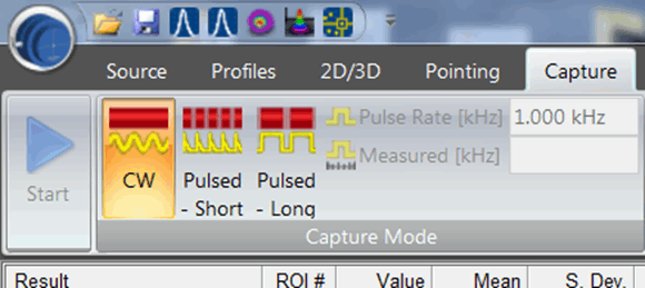 NanoScan 可以捕獲高重復率脈沖激光源,但不能由激光本身觸發(fā)。要在 NanoScan 上捕獲脈沖源,您必須在“捕獲”選項卡下選擇一種脈沖設置。激光脈沖率也必須大于 100 kHz。