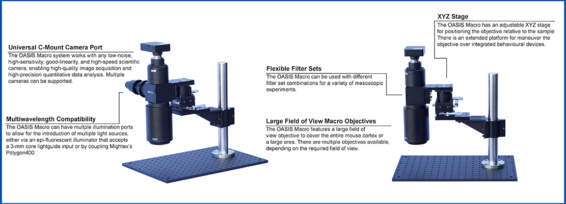 OASIS Macro 旨在對頭部固定小鼠的整個(gè)皮層或清醒動(dòng)物的大皮層區(qū)域的數(shù)千個(gè)神經(jīng)元群的活動(dòng)進(jìn)行成像。與傳統(tǒng)顯微鏡相比,與OASIS Macro兼容的鏡頭提供了更大的視野。