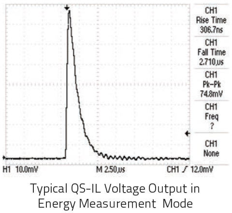 如果您需要在全光譜范圍內測量脈沖激光從 nJ 到 mJ 的性能,那么我們的熱釋電探測器是您的理想選擇!左圖的示波器軌跡為 QS9-IL 與作為積分焦耳計的 QS-I-TEST 配合使用時的典型輸出。請注意,該軌跡很快上升到峰值,然后較為緩慢地下降,這一軌跡由為積分電路選擇的 RC 時間常數決定。在這一配置下,您可以測量絕對脈沖能量、重復頻率和脈沖穩(wěn)定性。源的最大脈沖寬度由您選擇的 RC 時間常數決定,脈沖可以非常短!