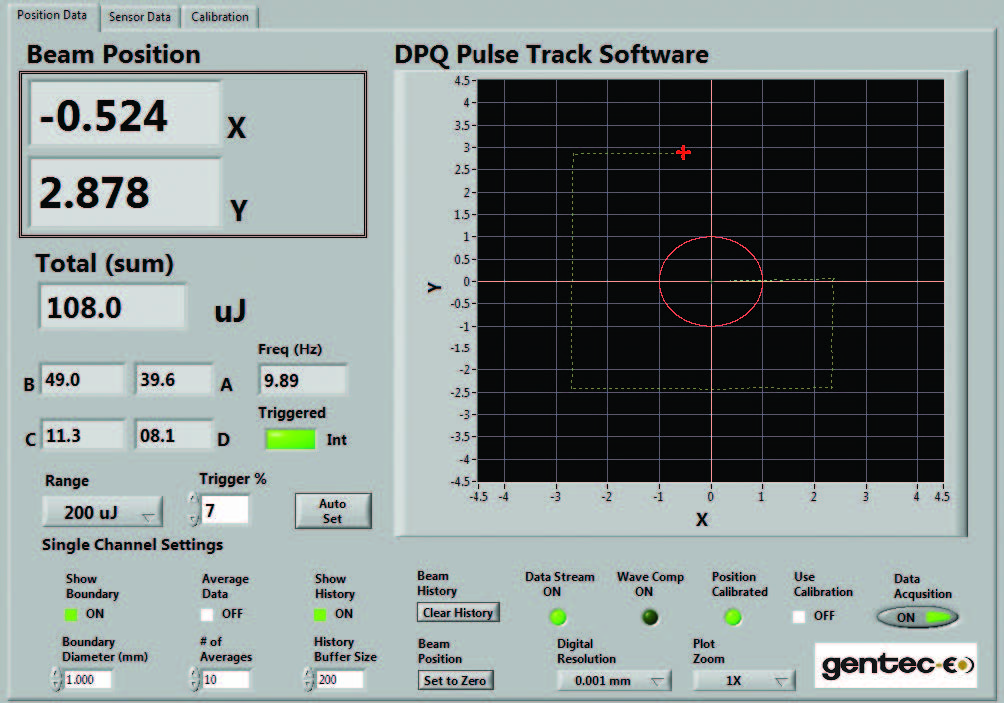 QUAD-4Track 包含功能強大的單機軟件 LabView,用于控制儀表、處理數(shù)據(jù)并顯示 X 軸和 Y 軸位置。該軟件還可顯示脈沖源的能量或功率以及重復(fù)率。本界面中的大型圖表顯示線束的矩心位置并實時追蹤其移動。該關(guān)鍵包含許多實用功能,例如:設(shè)置邊界、放大(2 倍至 128 倍)、設(shè)置分辨率、數(shù)據(jù)記錄等,不一而足。綠線代表追蹤歷史。