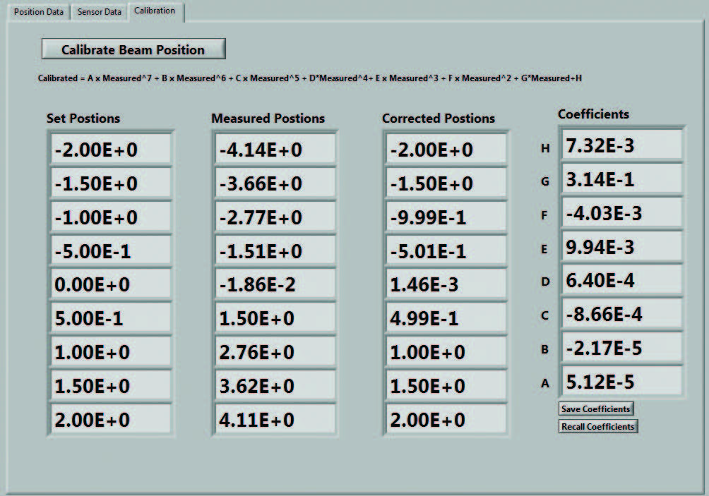 這需要使用微米級線性階段(只有 1 根軸)。如左側(cè)的校準(zhǔn)界面所示,該程序包括儀表調(diào)零,移動 QUAD 探測器至九個分立位置(+2000 mm 至 -2000 mm)并采集 QUAD 讀數(shù)。然后,該程序會確定校正系數(shù)(最后一欄)并將其運用到原始數(shù)據(jù)以到達“校正位置”?,F(xiàn)在,QUAD 探測器已校準(zhǔn)完畢!