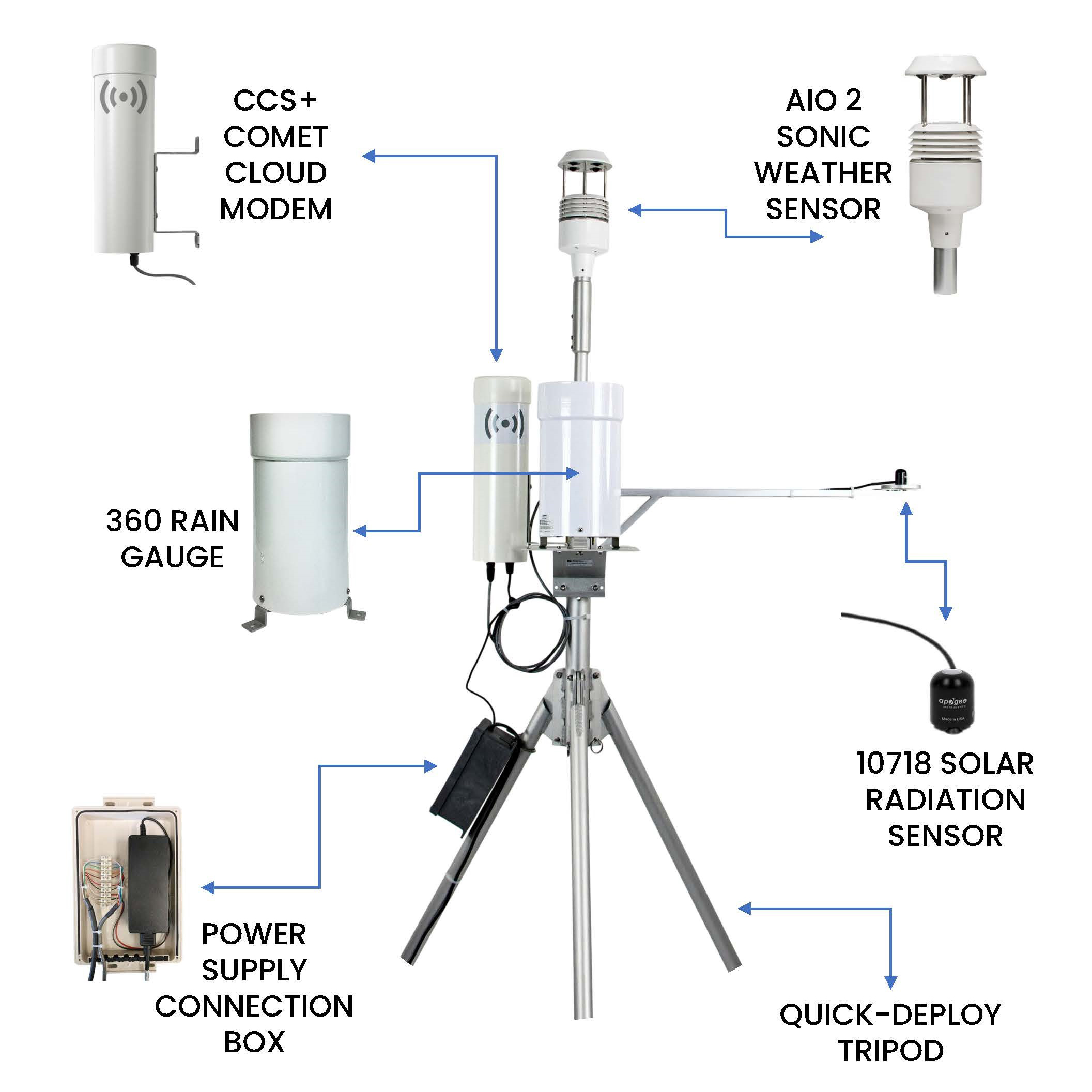 ReadyWeather 是一個(gè)功能齊全的氣象站,由 Met One 的 AIO 2 聲波天氣傳感器、CCS+ Comet 云調(diào)制解調(diào)器、360 降水量計(jì)和 10718 太陽(yáng)輻射傳感器組成,所有這些都安裝在一個(gè) 10 英尺的鋁制三腳架上,帶有電源和電纜接口盒。在您定制的網(wǎng)頁(yè)儀表板上利用實(shí)時(shí)云數(shù)據(jù)查看和檢索,自動(dòng)將數(shù)據(jù)上傳到云端,以便從任何智能設(shè)備或計(jì)算機(jī)進(jìn)行遠(yuǎn)程訪(fǎng)問(wèn)。