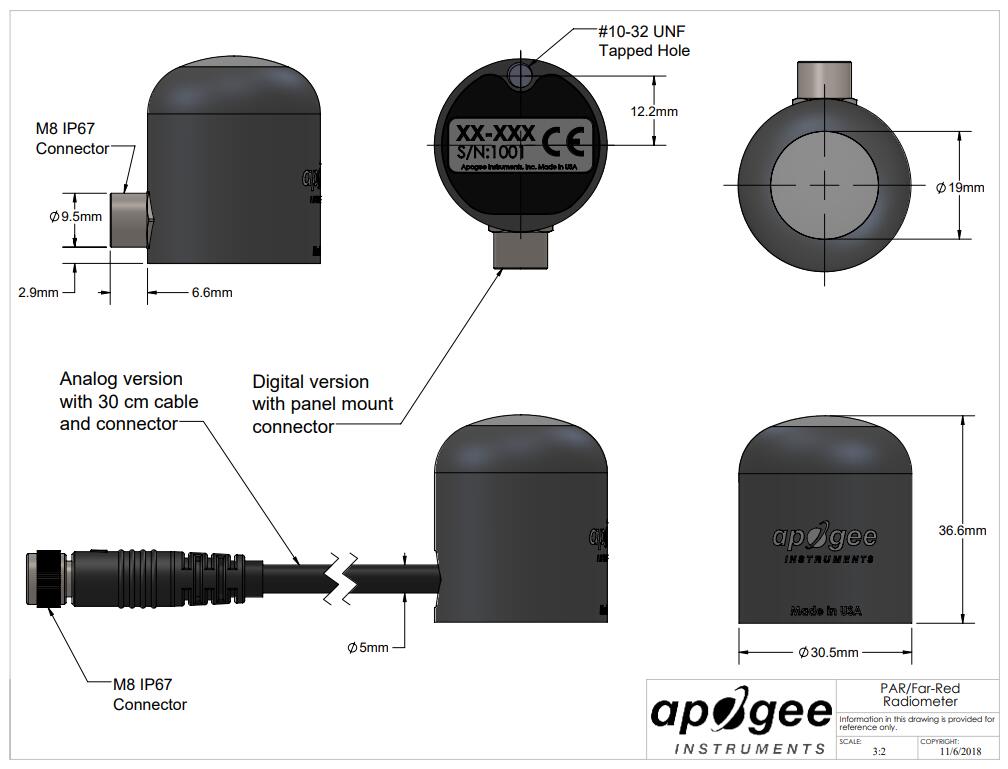 輸出(靈敏度)[因傳感器而異] | 0.01 mV 每 μmol m?2 s?1 (PAR);0.03 mV/μmol m?2 s?1(遠(yuǎn)紅光) |
