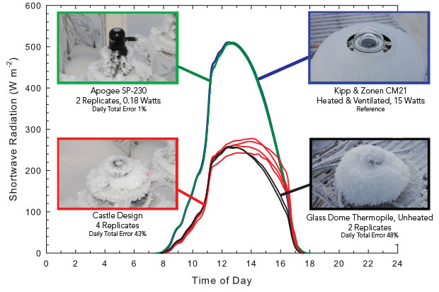 猶他州洛根 1 月霜凍后的太陽(yáng)輻射,直到上午 11 點(diǎn)都是陰天 兩個(gè)復(fù)制的 Apogee SP-230 日射強(qiáng)度計(jì)與加熱和通風(fēng)的參考日射強(qiáng)度計(jì)幾乎相同。盡管上午 11 點(diǎn)后陽(yáng)光明媚,但兩個(gè)未加熱的玻璃圓頂熱電堆和四個(gè)復(fù)制的未加熱城堡設(shè)計(jì)日射強(qiáng)度計(jì)上的霜直到下午 4 點(diǎn)(1600 小時(shí))后才融化。