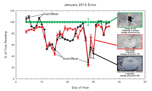 Logan UT 中三組日射強(qiáng)度計(jì)的霜雪積聚效應(yīng),以真實(shí)讀數(shù)的百分比表示。Castle 設(shè)計(jì)和未加熱的熱電堆傳感器一個(gè)月的平均誤差為 20%,最大誤差為 80%。圖 1 的數(shù)據(jù)來(lái)自第 12 天。