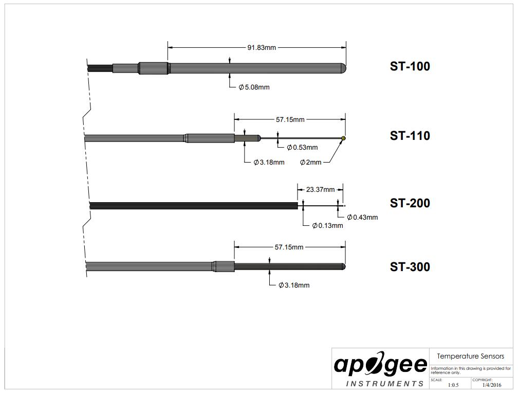ST-110 是一款高精度熱敏電阻(-40 至 60 C 范圍內為 ± 0.1 C),旨在很大限度地減少太陽能負載和熱傳導。在熱敏電阻后面的電纜上使用白色熱縮管以減少太陽能負載??点~線用于很大限度地減少沿著電線向熱敏電阻的熱傳導。ST-110 設計用于在 Apogee 的 TS-100 吸氣輻射防護罩中進行空氣溫度測量,也可用于其他公司的靜態(tài)多板防護罩。