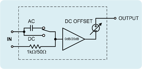 圖1顯示了TS250波形放大器的功能等效圖。它由交流耦合或直流耦合輸入、可選輸入阻抗(高阻抗或 50Ω)、可選增益級(0dB 或 20dB)、高電流放大器和直流輸出偏移組成。可調(diào)節(jié)的直流偏置設(shè)置輸出直流電壓。此直流偏移功能非常適合 LDO 或放大器 PSRR 測量,因為它們需要直流電壓。