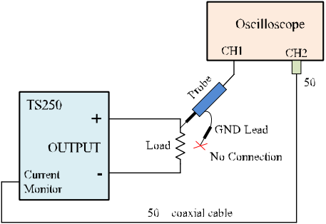 TS250 波形放大器包括一個電流監(jiān)視器輸出,可連接到示波器以監(jiān)視波形電流。當(dāng)端接到 50Ω 時,電流監(jiān)視器增益范圍為每安培 100mV。例如,2A 輸出電流將在電流監(jiān)視器輸出上產(chǎn)生 200mV 輸出電壓。如果示波器設(shè)置為高阻抗(1MΩ),則輸出電壓將為200mV/A。特別是對于高頻或方波,建議使用 50Ω 端接。如果示波器沒有內(nèi)置 50Ω 端接器,您可以購買TS220 外部 50歐姆端接器來自我們。使用圖 2 將電流監(jiān)視器連接到示波器。如果如圖 2 所示同時監(jiān)控電流和電壓,建議不要連接電壓探頭接地線。