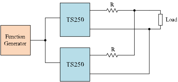 圖 3. 并聯(lián)兩個 TS250 波形放大器使輸出電流加倍