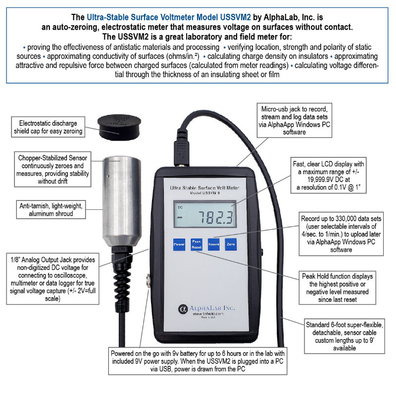 USSVM2 型穩(wěn)定表面電壓表采用傳感器快門/開關(guān)技術(shù),可提供長(zhǎng)期穩(wěn)定性而無(wú)漂移。該技術(shù)還消除了由于帶電空氣分子(空氣離子)導(dǎo)致的錯(cuò)誤或偏移讀數(shù)。該傳感器有一根 29 英寸的可拆卸電纜,可延長(zhǎng)至 9 英尺。