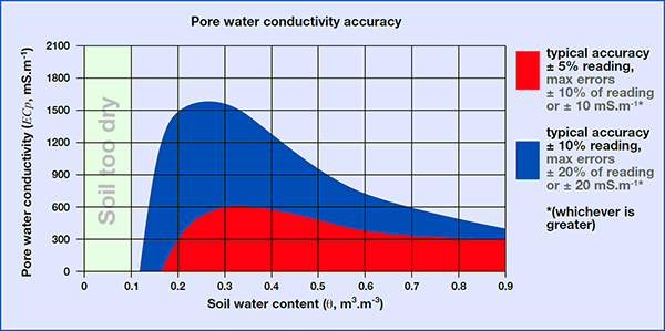 WET 傳感器能夠計(jì)算孔隙水電導(dǎo)率 (ECp),這是植物根部可用水的 EC。ECp 計(jì)算源自介電特性之間的近似關(guān)系。這特別適用于 WET 傳感器讀數(shù),這些讀數(shù)是在土壤/基質(zhì)的相同定義區(qū)域內(nèi)以相同頻率獲取的。該近似值在大多數(shù)土壤中有效,在礦棉和其他人造基質(zhì)介質(zhì)中尤其準(zhǔn)確。