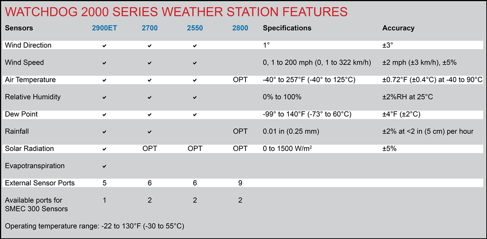 WatchDog 2800 工作站非常適合需要多個傳感器測量溫度、土壤濕度、作物冠層光照或葉片濕度數(shù)據(jù)的情況。通過選擇多達 8 個插入式傳感器以及 1 個可選的雨量傳感器,根據(jù)您的應用定制電臺。2800 Station 具有與其他 WatchDog Station 相同的內(nèi)存、電源和 LCD,并接受相同的通信設(shè)備和傳感器。需要 SpecWare Pro 軟件。