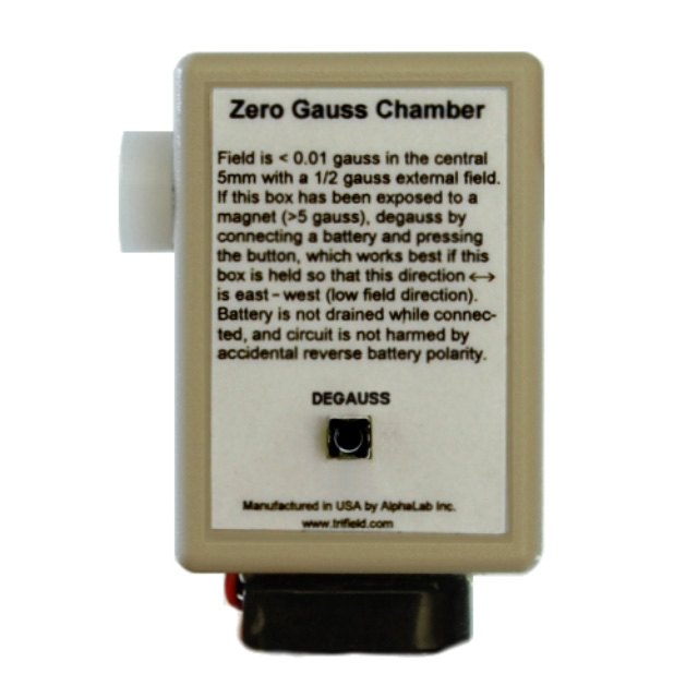 用外部消磁器消磁零高斯腔是困難的,即使消磁器是可用的。通常,外部消磁器的強(qiáng)度不足以消除內(nèi)部屏蔽層的磁性,使用消磁器(相當(dāng)大)也不方便。當(dāng)使用 ZGC 時(shí),只需按一下消磁按鈕,內(nèi)部場(chǎng)就會(huì)在室中心5mm 寬 x9.4 mm 直徑區(qū)域內(nèi)小于0.01高斯(在所有三個(gè)軸上)。連接電池時(shí),除按消磁按鈕外,不消耗任何電源。即使這樣,一個(gè)典型的9伏電池(包括)可以超過1000萬消磁周期的電力。消磁后,無論腔室的方向如何(在地磁場(chǎng)內(nèi)) ,磁場(chǎng)都小于0.01高斯。如果在消磁過程中,腔室的長(zhǎng)軸(下圖中的左右方向)特別指向東西方向,那么內(nèi)部磁場(chǎng)將小于0.002高斯,盡管大多數(shù)高斯計(jì)并不需要這樣的精度。