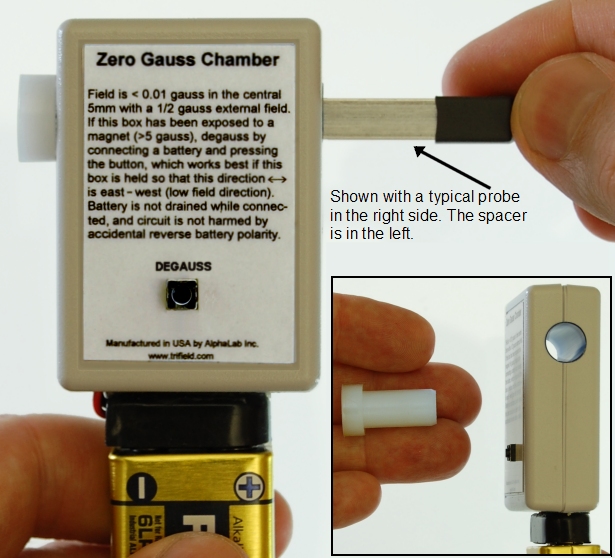 白色塑料部分(間隔器)可以在任何時(shí)候拆卸,但如果你想將高斯計(jì)探頭置于腔室的中心,就應(yīng)該使用它。當(dāng)放置在任何一端時(shí),這個(gè)白色墊片將允許探針的一端插入到距離腔室中心1.6毫米處。因此,AlphaLab模型VGM, GM-2, GM-3, 1-ST和1-HS的實(shí)際傳感器將在腔室中正確地居中。零高斯區(qū)域直徑9.4毫米(0.370“),并占據(jù)中心5毫米(0.197“)在腔內(nèi)。(腔室的長(zhǎng)軸尺寸為36毫米,或1.42英寸)。在中心5毫米處,無論腔室朝向如何,按下黑色消磁按鈕后,磁場(chǎng)均< 0.01高斯。在消磁時(shí),只要腔室不從其方向旋轉(zhuǎn)超過30度,它將保持< 0.01高斯。(請(qǐng)注意,如果室外的磁場(chǎng)小于0.6高斯,這是地球磁場(chǎng)的特征,則此規(guī)范有效。)插入如下所示的高斯計(jì)探頭并調(diào)零高斯計(jì)。