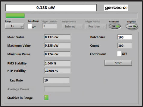 如果您需要測(cè)量從皮瓦到毫瓦的較低功率級(jí)別,我們推薦 PH 或 PH-B 探測(cè)器。在左側(cè)所示的軟件屏幕中,我們提供了一個(gè)在“統(tǒng)計(jì)數(shù)據(jù)”顯示模式下工作的數(shù)據(jù)集。我們已在手動(dòng)重置模式下將批次大小設(shè)置為 100 個(gè)數(shù)據(jù)點(diǎn)。您可以看到實(shí)時(shí)功率(138 毫微瓦)和其他全部統(tǒng)計(jì)數(shù)據(jù):平均數(shù)、大值、小值、均方根和 PTP 穩(wěn)定性。在左下角處,顯示的波長為 300 納米。您可在此輸入激光器波長并使用波長糾正系數(shù)。