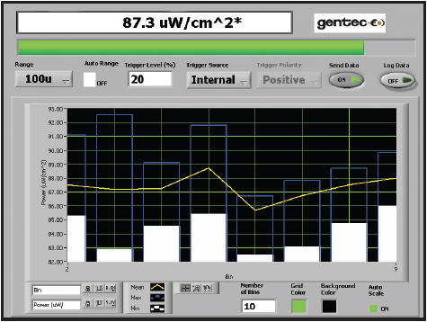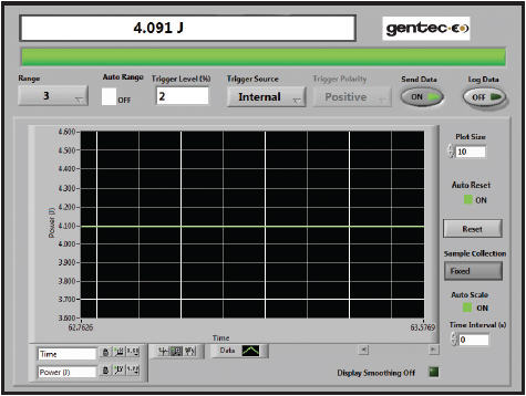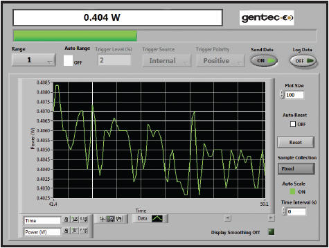您可以選擇我們提供的任意感溫探測(cè)器測(cè)量從幾微瓦到 30 千瓦的激光器功率。我們使用我們制造的靈敏度高的一款熱電堆探測(cè)器,即 XLP12-3S-H2 型,生成了左圖所示的軟件屏幕。我們選擇的是“示波器”模式,您可以在此監(jiān)控功率,并同時(shí)查看實(shí)時(shí)功率讀數(shù)(0.404 瓦)、條形圖和帶狀圖。通過此屏幕還可訪問量程、觸發(fā)器、自動(dòng)刻度和很多其他監(jiān)視功能。