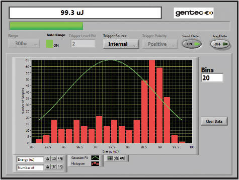 您可以選用我們提供的多款 QE 系列大面積熱釋電探測(cè)器,對(duì)從 50 nJ 到 250 J 以及從紫外線到遠(yuǎn)紅外線的能量進(jìn)行測(cè)量。為演示此功能,我們選用 QE8SP-B-BL 和 M-LINK。通過“直方圖”屏幕,可以繼續(xù)查看實(shí)時(shí)測(cè)量值、顯示數(shù)據(jù)集能量分布的直方圖以及擬合高斯曲線。請(qǐng)注意,您仍然可以訪問量程、觸發(fā)器、波長等儀器控制值。