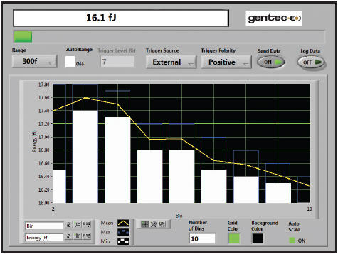 對(duì)于從 fJ 到 μJ 量程以及從紫外線到近紅外線的測(cè)量,我們建議使用 PE3B-Si 探測(cè)器。它使用低端能量探測(cè)器技術(shù)。另外 M-LINK 還使用了脈沖平均和降噪技術(shù),為您提供各種優(yōu)勢(shì)。在右側(cè)示例中,我們?cè)凇捌骄怠蹦J较鹿ぷ鞑⒉东@了一個(gè)數(shù)據(jù)集。條形分別代表?。ò咨┖痛螅ㄋ{(lán)色)能量值。帶狀圖根據(jù)平均能量值繪制而成。您需要選擇此處給出的“BINS”數(shù)?!敖y(tǒng)計(jì)數(shù)據(jù)”屏幕中提供了“脈沖平均”功能。