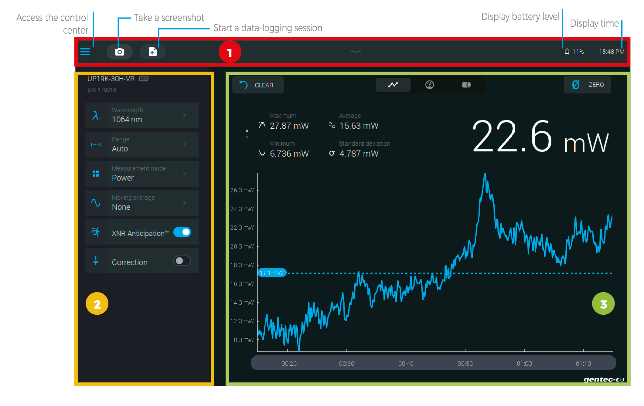 1 - 導(dǎo)航欄 —— 在屏幕頂部,有直接進入控制中心的通道、數(shù)據(jù)采集按鈕和各種指示值(電池電量和時間)。