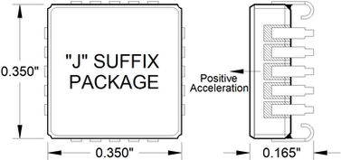 The model 1527 sensitive axis is perpendicular to the bottom of the package, with positive acceleration resulting from a positive force pushing on the bottom of the package. The seismic center is located on a centerline through the dual sense elements and halfway between them.