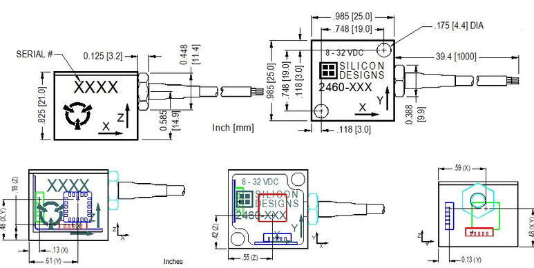 Each SDI 2460 and 2466 triaxial accelerometer features three orthogonally mounted low noise accelerometers within a single, rugged, epoxy sealed, anodized aluminum case. Onboard voltage regulation and an internal voltage reference eliminate the need for precision power supplies. They are relatively insensitive to temperature changes and gradients. Individual axis directions are marked on the case with positive acceleration defined as acceleration in the direction of the axis arrow. The robust, anodized aluminum case is epoxy sealed and can be mounted easily via two screws, an adhesive, or by attaching a magnet.