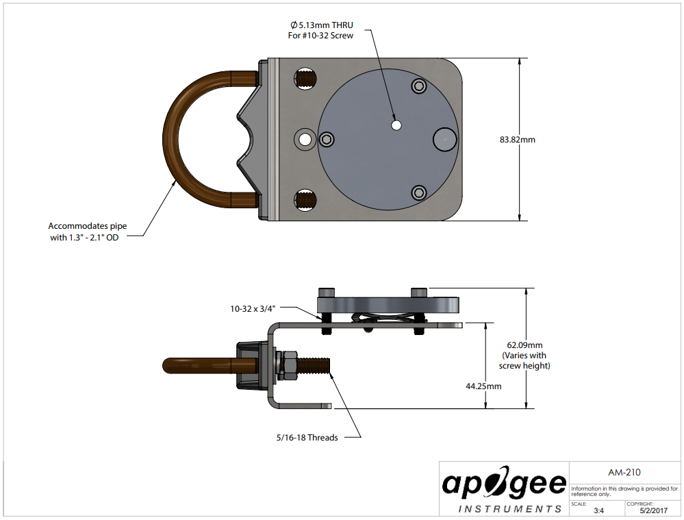 AL-120 MOUNTING BRACKET :The AL-120 solar mounting bracket with leveling plate is designed to mount Apogee Instruments' pyranometers, pyrgeometers, quantum sensors, red—far-red sensors, PAR-FAR sensors, and ultraviolet sensors to a mast or pipe with an outer diameter of 1.3" - 2.1".
