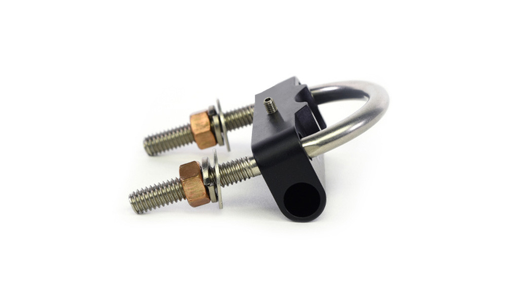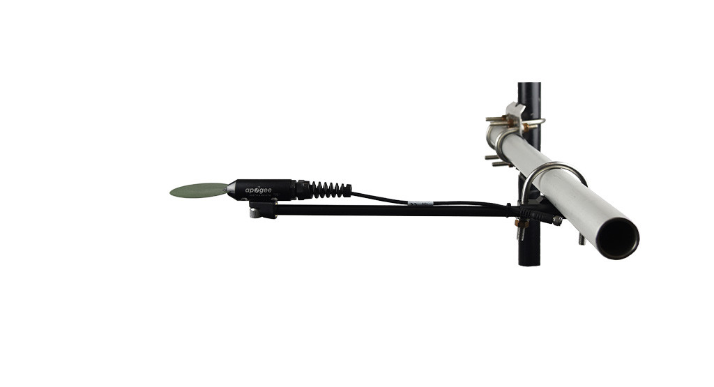 The AM-260 mounting fixture can be used as a more permanent mounting option and includes a U-bolt bracket assembly for mounting to the mast or pipe, and a mounting rod attached to the body of the radiation frost detector. The U-bolt can be adjusted to level the sensor before tightening.