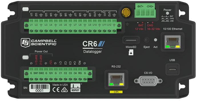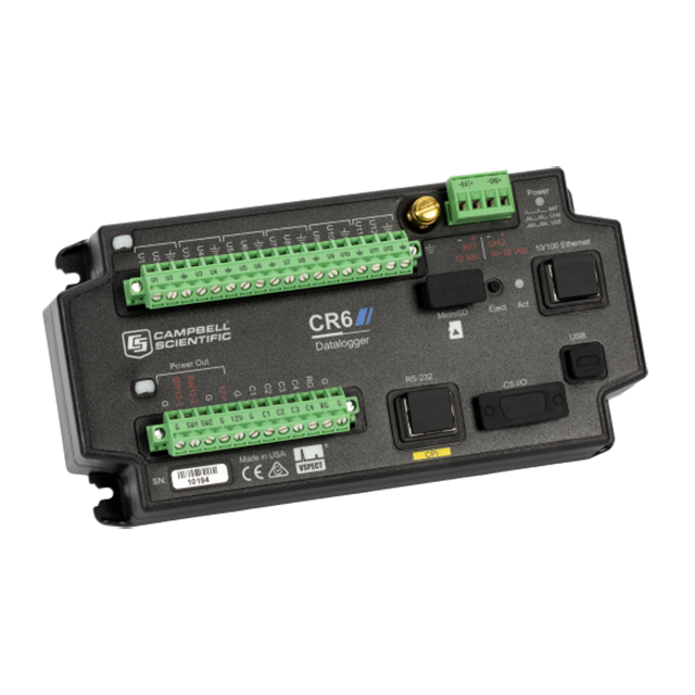 The CR6 Measurement and Control Datalogger is a powerful core component for your data-acquisition system. The CR6 datalogger provides fast communication, low power requirements, built-in USB, compact size, and high analog input accuracy and resolution. It uses universal (U) terminals to allow a connection to virtually any sensor—analog, digital, or smart. This multipurpose data logger is also capable of doing static vibrating wire measurements.