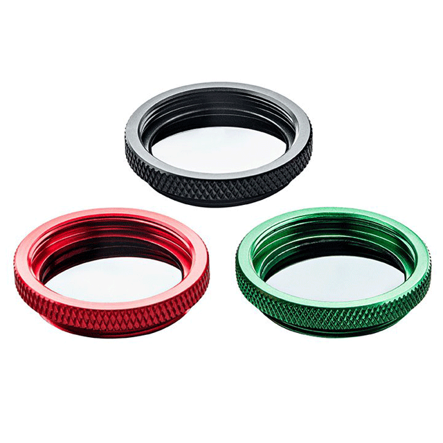 The individual filters come in three versions, the ND1 filter in the red housing with ~10% transmission in the visible, the ND2 filter in the black housing with ~1% transmission and the ND3 filter in the green housing with ~0.1% transmission. The individual filters can be screwed on top of each other and thus stacked and also can be combined with beam splitters.