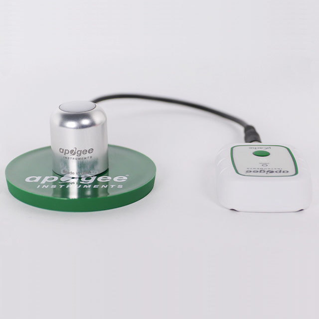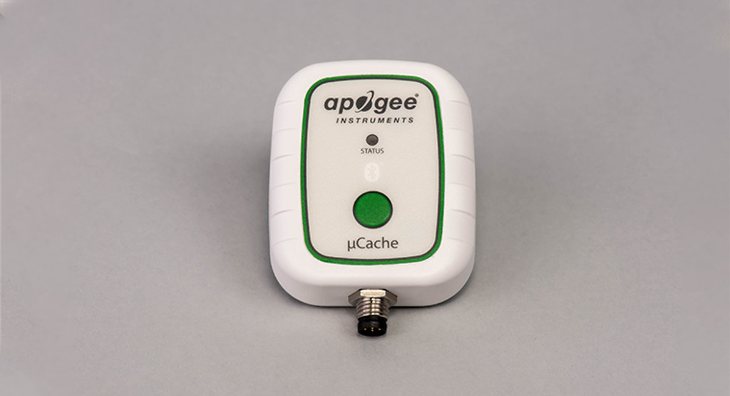 The AT-100 microCache (μCache) micro-logger is a rugged, standalone, battery-powered device that can collect over 400,000 data points. The microCache connects your sensor to your iOS or Android device via Bluetooth using our free ApogeeConnect app. The app allows you to make real-time measurements, set custom datalogging intervals, monitor and graph daily lights integrals, measure photoperiods, download datasets, and more.
