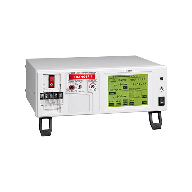 In order to prevent the danger of electric shock, electrical devices use power supplies that are isolated from parts of the device that may come into contact with the body. However, it is impossible to achieve infinite insulation resistance. Some leak current always exists, and its magnitude changes as the insulation degrades over time. The LEAK CURRENT HiTESTER ST5540/ST5541 provides an easy-to-operate solution for measuring leak current in electrical devices, making it eminently suitable for use in an extensive array of applications, ranging from production lines to equipment maintenance and inspections.