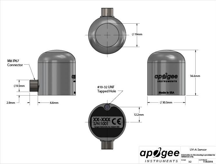 The SU-221 is a digital UV-A sensor with SDI-12 communication protocol and high-quality cable terminating in pre-tinned pigtail leads for easy connection to dataloggers and controllers. The sensor offers a low-cost option for detecting UV radiation from 300 to 400 nm and is calibrated in energy flux units of Watts per square meter. Typical applications include monitoring the filtering ability and stability of various materials, measuring UV-A radiation in outdoor environments and laboratory use, and monitoring UV radiation in horticultural operations environments. Sensor includes IP68 marine-grade stainless-steel cable connector to simplify sensor removal and replacement for maintenance and recalibration.