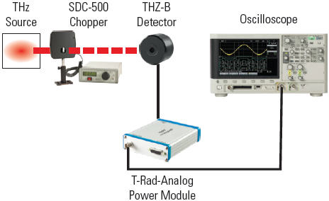 This is another analog set-up option that we recommend if you have to measure very low power levels (i.e. less than 5 ?W) where the signal may be buried in the broadband noise. The voltage output of the analog THZ-B-DA detector, powered by our T-RAD-ANALOG, is routed to the Lock-In Amplifier input, and the Sync Output of our SDC-500 Chopper is connected to the reference input. The Lock-In Amplifier will lock on the chopping frequency and you can dial in a long integrating time and measure a very low RMS voltage. The voltage divided by our Voltage Responsivity (V/W) equals the power of the source.